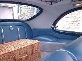 | High standard re-trim in progress, doesn't the door trim look gorgeous? | Headlining going in - trimmer enjoys a cuppa during the work | Map netting under the roof, plus new leather boot panel. |